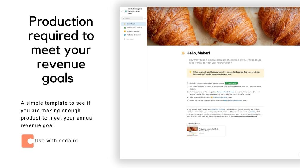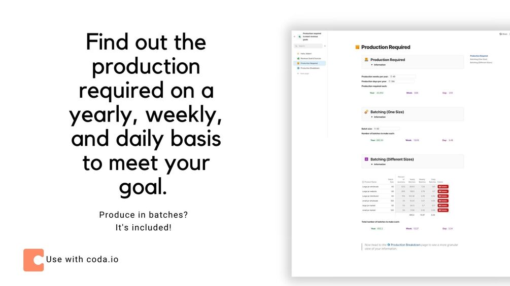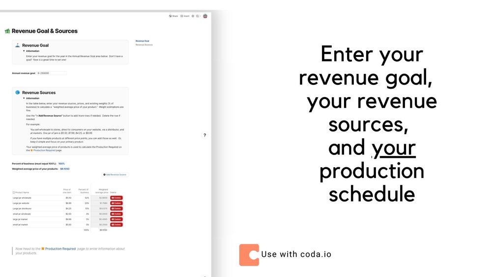 Set your revenue goal and then find out the required production to meet your goal with this simple document made with love in coda.